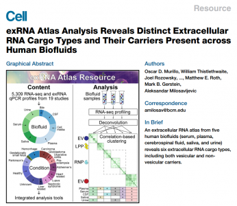 Murillo OD, Thistlethwaite W, Rozowsky J, Subramanian SL, Lucero R, Shah N, Jackson AR, Srinivasan S, Chung A, Laurent CD, Kitchen RR, Galeev T, Warrell J, Diao JA, Welsh JA, Hanspers K, Riutta A, Burgstaller-Muehlbacher S, Shah RV, Yeri A, Jenkins LM, Ahsen ME, Cordon-Cardo C, Dogra N, Gifford SM, Smith JT, Stolovitzky G, Tewari AK, Wunsch BH, Yadav KK, Danielson KM, Filant J, Moeller C, Nejad P, Paul A, Simonson B, Wong DK, Zhang X, Balaj L, Gandhi R, Sood AK, Alexander RP, Wang L, Wu C, Wong DTW, Galas DJ, Van Keuren-Jensen K, Patel T, Jones JC, Das S, Cheung KH, Pico AR, Su AI, Raffai RL, Laurent LC, Roth ME, Gerstein MB, Milosavljevic A. exRNA Atlas Analysis Reveals Distinct Extracellular RNA Cargo Types and Their Carriers Present across Human Biofluids. Cell. 2019 Apr 4;177(2):463-477.e15. doi: 10.1016/j.cell.2019.02.018.